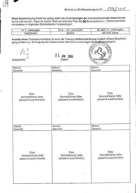 Die Fotodokumentation ist mit der EU-Bescheinigung verbunden und mit dem Siegel der Behörde versehen. Solange die Fotodokumentation den Angaben entsprechend weitergeführt wird behält die EU-Bescheinigung ihre Gültigkeit. Bei einer Weitergabe der entsprechenden Schildkröte braucht dann keine neue EU-Bescheinigung beantragt werden.