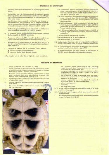 • zur Weitergabe von europäischen Landschildkröten wird eine (EG) EU-Bescheinigung  mit Vermarktungsgenehmigung und  Fotodokumentation gemäß EG-Verordnung Nr. 338/97 benötigt.