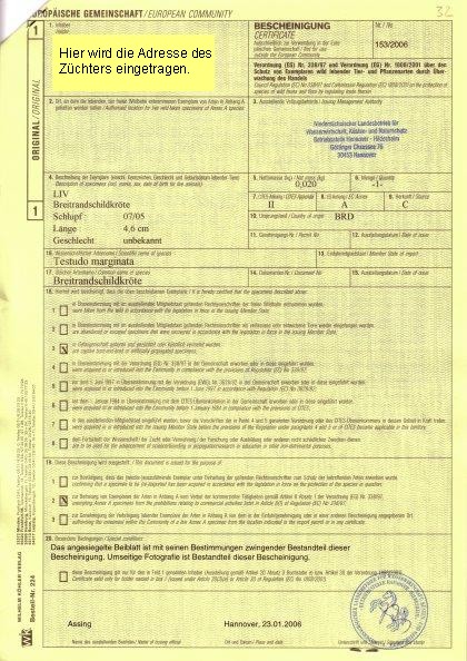 0hne diese gültige EU-Bescheinigung dürfen Griechische Landschildkröten und Breitrandschildkröten nicht gekauft oder verkauft werden.