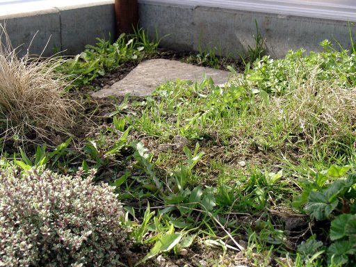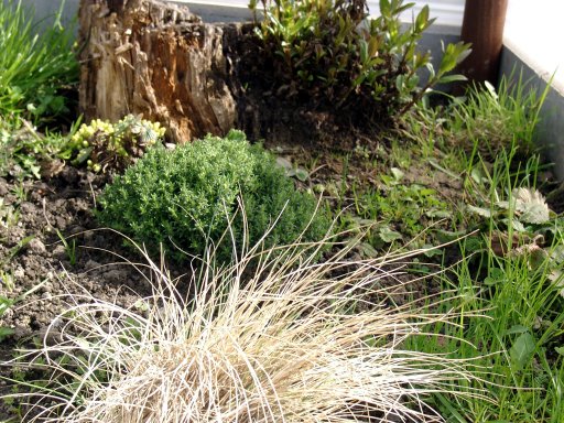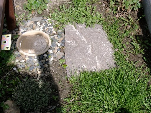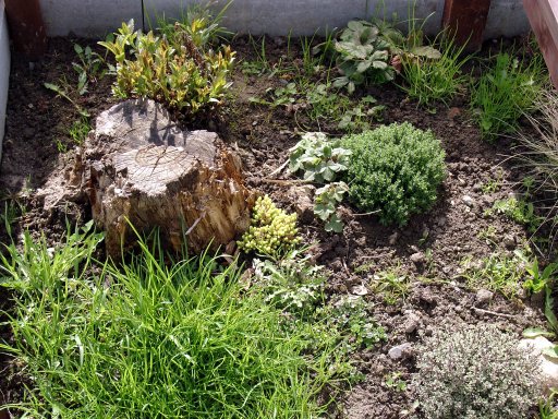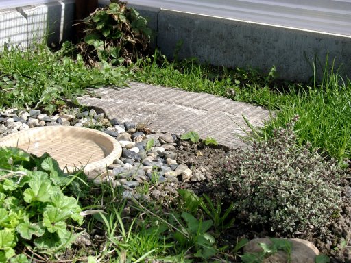 2 Thymianpflanzen und der Mauerpfeffer. Um die Wasserschale wurden kleine Steine gelegt.